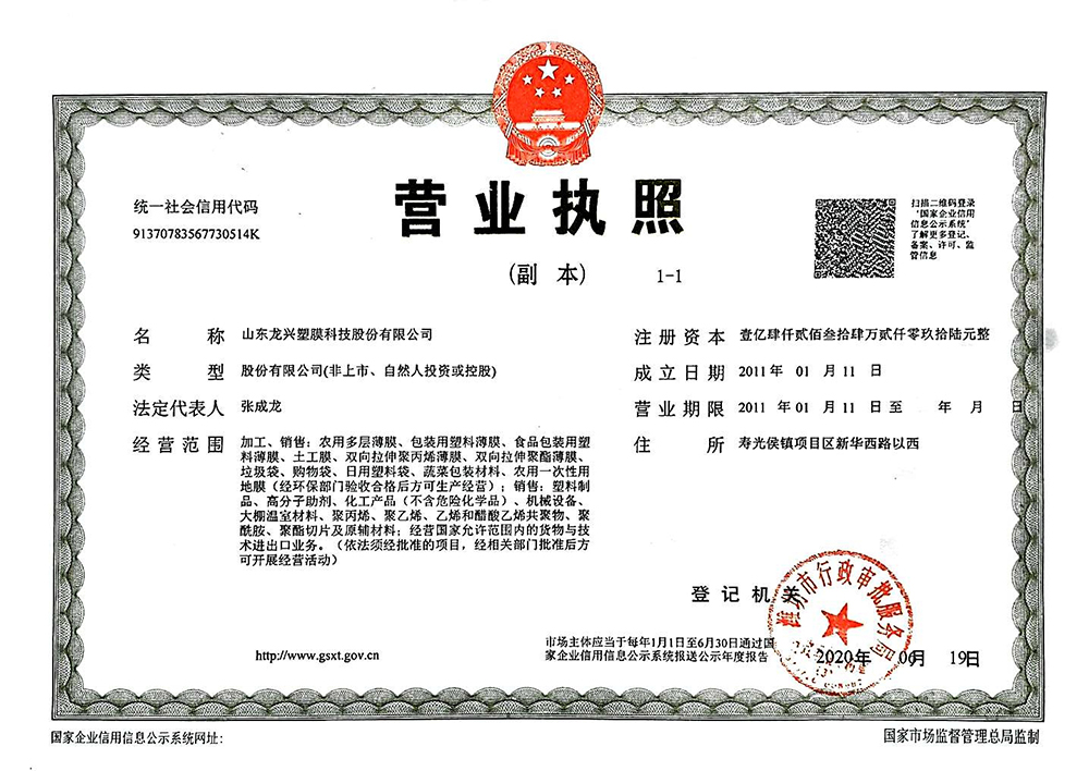 山東龍興塑膜科技股份有限公司前身為山東壽光龍興農膜有限公司組建于2011年,2018年10月重組,目前是壽光市國有控股公司、高新技術企業,是專業生產高檔農用薄膜、工業用薄膜的企業,是一家以產品制造為主,集科研開發、產品設計、技術服務于一體的綜合性企業。公司現有職工228人,各類工程技術人員97人,管理人員20余人,注冊資金14234.2096萬元,總資產102314萬元,目前是壽光市國有控股公司、高新技術企業。公司是中國塑料加工工業協會農膜專業委員會會員單位,中國復合材料工業協會會員單位,中國塑料加工工業協會雙向拉伸聚酯薄膜專業委員會會員單位...